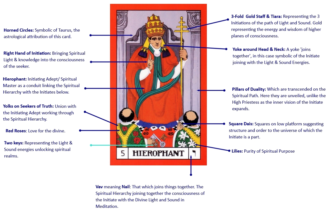 This transition is that of giving in to the inner power of the Light and Sound. Progress is made by trusting the commitment and devotion to The Path that was made at The High Priestess as well as trusting the Light and Sound. This principle also applies to interactions in the world, where the Initiate needs to be open to and learn from situations before reacting.