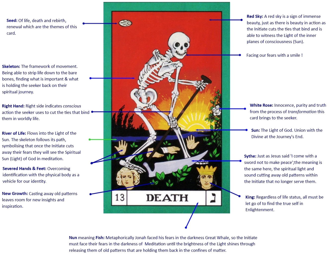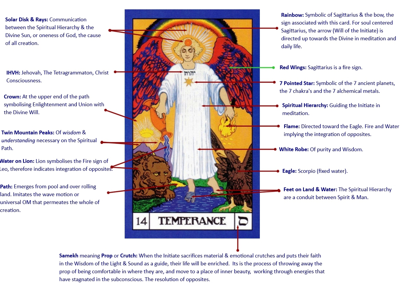 This card completes the physical, emotional and mental journey with the Initiate at ease with their interaction in the world, their feelings and personality and their philosophical outlook and higher sense of self.