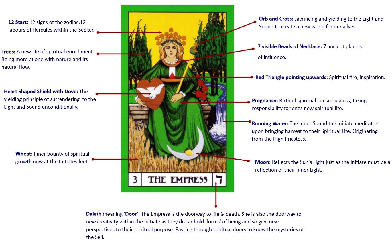 If this transition from accepting what is required of us (The High Priestess) to being able to give in or yield (The Empress) to the Light and Sound is not made, the journey will either end at this point or will become a somewhat difficult undertaking. Practising austerity through many hours of meditation on its own does not always produce the intended results.