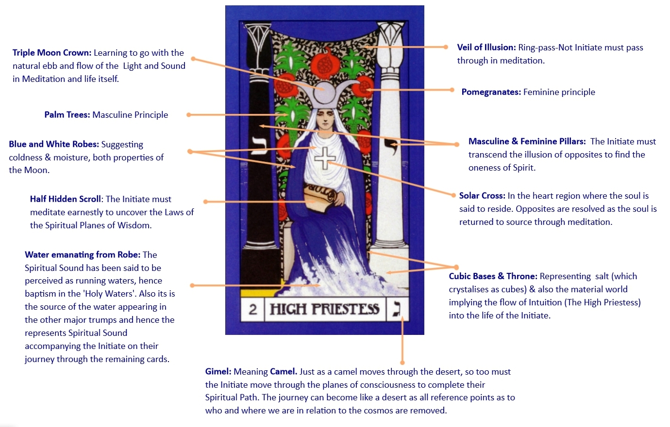 The High Priestess promises to reveal but keeps things hidden. The Scroll she bears in half covered so the secrets of esoteric knowledge need to be sought and not just given. She sits in front of the two pillars which show the gateway to what lies behind the veil of pomegranates which are said to represent the ancient mysteries.