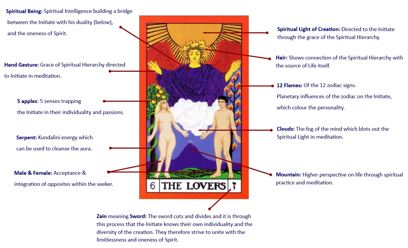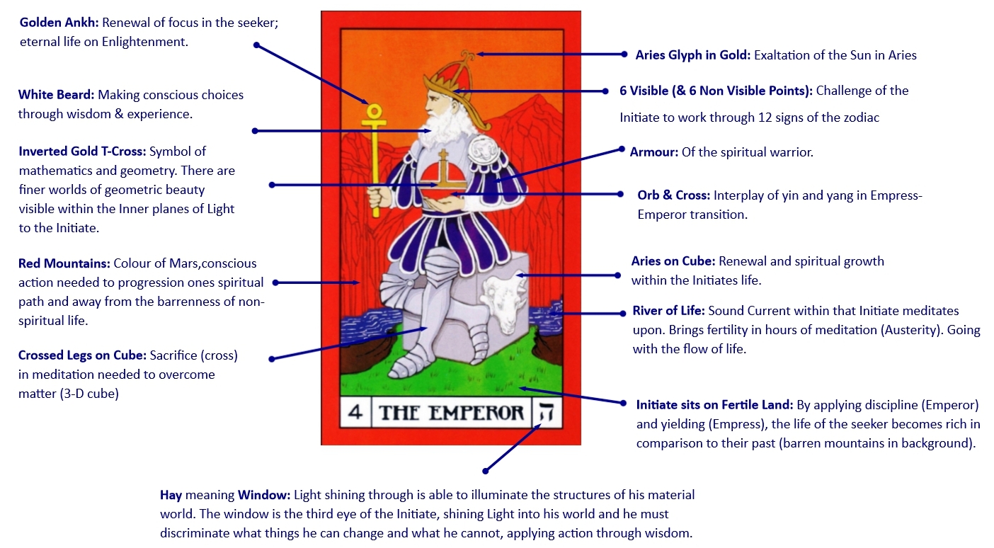 It is very important to note that this card occurs before The Emperor or Austerity in the process. The Initiate must apply themselves to their meditation but this must be done by surrendering to the Light and Sound. The discipline of The Emperor required to actually meditate regularly is necessary but therefore secondary to the attitude that the Initiate takes into their meditation; hours spent ‘meditating’ where the Initiate tries to be in control of the process are unlikely to produce much progress.