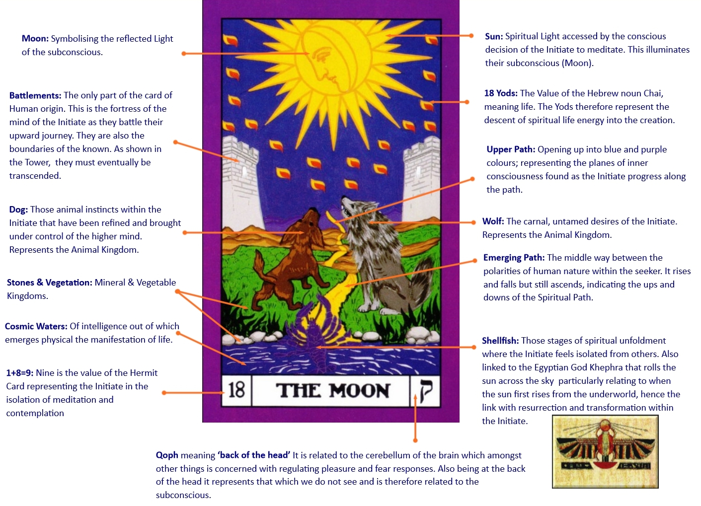 Initiation gives an opportunity to break free from outdated concepts, thinking and being. To carry the state of Enlightenment and teach others we may need to change how we think of ourselves, of others, of the world, and of life. The Moon represents the process of transforming our sense of self by facing up to what we think we are, and escaping from its limitations.