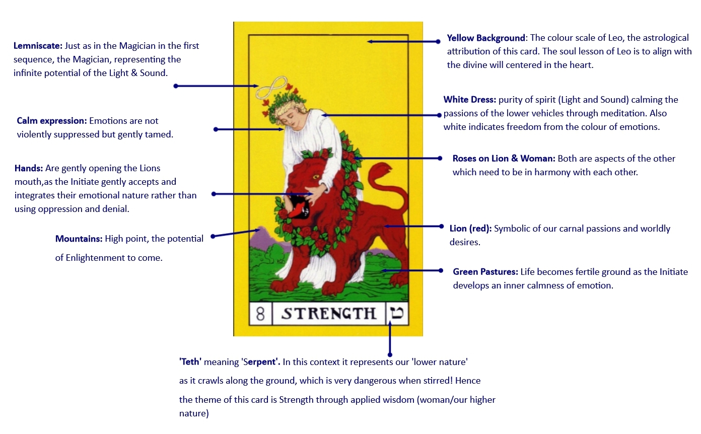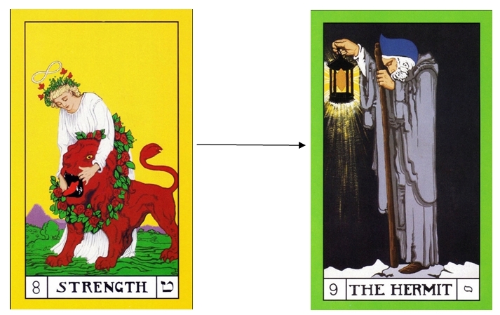 ‘The Emotional Sequence’ or facing and coming to terms with internal emotional nature and reactions (Strength to Death Cards), and finally