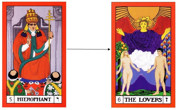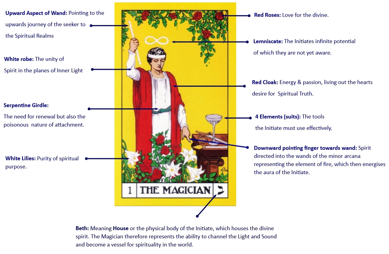 The first transition in the first sequence for the Initiate to make is between The Fool and The Magician. This transition is that of initial re-engagement between the Initiate on their spiritual path and the external world – there is a new awareness of separation from the external world that has captivated the person up until this point, an opportunity to start again. The transition between these two cards is a move from the first revelation of the Light and Sound in The Fool to some recognition in The Magician of what they need to resolve within themselves, the tasks ahead and what may be required of them to proceed with the journey.