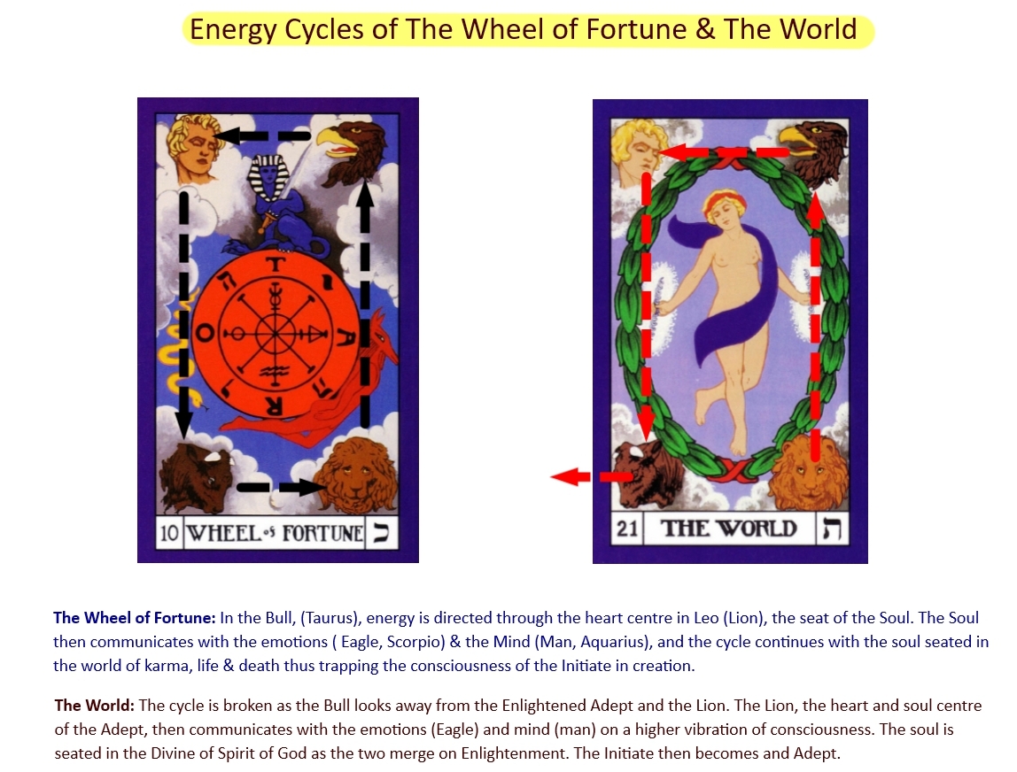 In The World, only showing the heads may symbolise that only the higher aspect of the figure has been retained, the rest not essential to the life of a spiritual person. Also, since in The World they are separate from the figure, the Initiate is aware that their nature is separate from even these higher aspects of personality and mind.