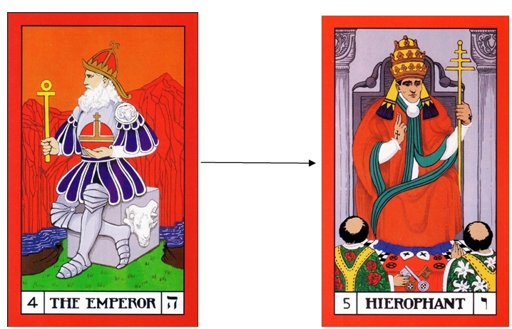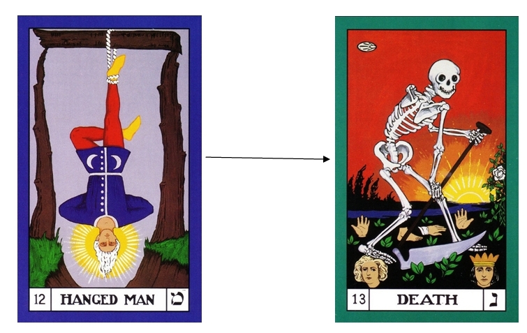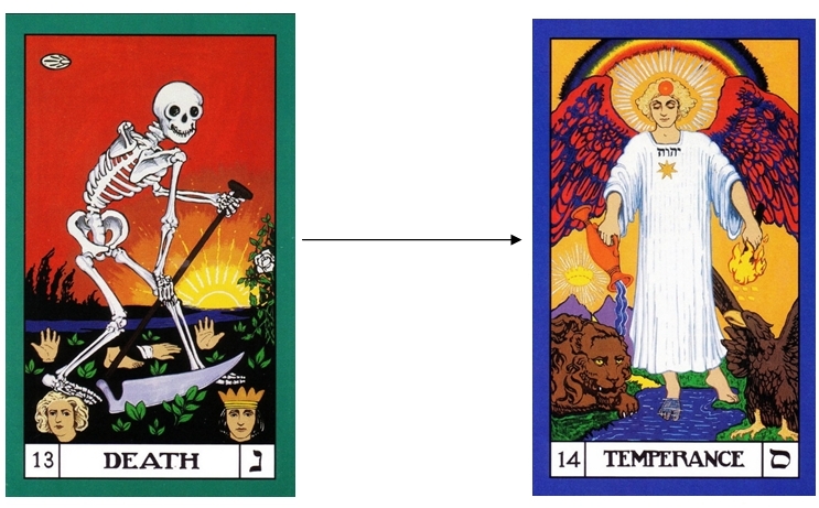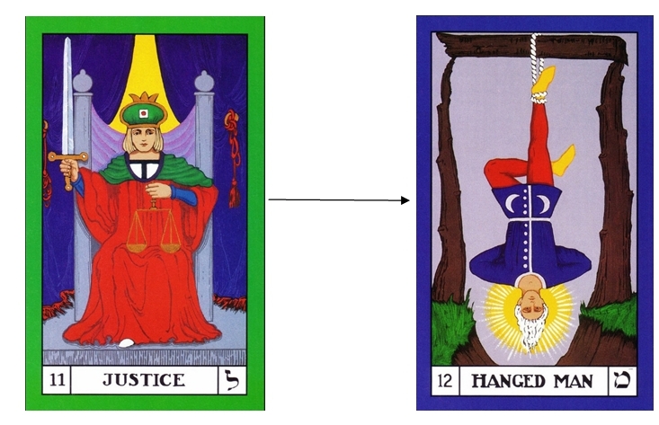 The other two cards in the same column (Justice and The Emperor) enabled transitions to be made in our interactions with the world and in our feelings; both based partly on the viewpoint from our mind. Since in the third sequence we are challenging our mind itself, we cannot really use just the same process.