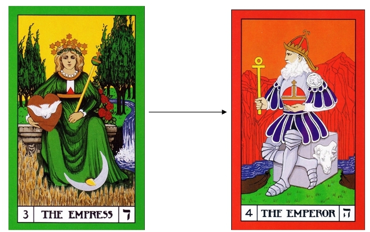 Other difficulties may be that the individual reacts against realisations from their meditation, the external teachings from The Path, or from personality clashes with other Initiates. The Empress shows that being “yin” in the face of conflict disables the potential power of the conflict in the same way that a kung fu master would move alongside and away from an attack and then use the power of the attack against the attacker.