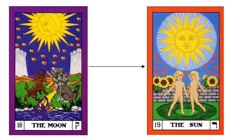 This transition is about balancing the processes of the previous two cards – being able to apply and express ourselves and interact with the emotional and physical world through our thinking (The Star) whilst remaining detached and not being caught up in the sense of self that is created through the attachments that are formed in those interactions (The Moon). It is again about balancing application and detachment. Difficulties are again about favouring one aspect, applying oneself too much or being too detached. The Initiate may have become too yielding (too yin) or too austere (too yang) or may alternate between periods of yielding and austerity.