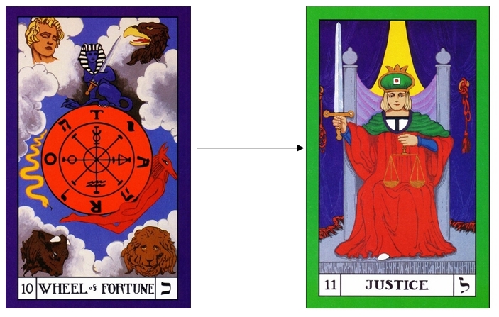 This is why using meditation to lift us out of our thoughts is so essential to see and overcome engrained mental patterns and ideas. The Moon is perhaps more of a continuation of the process of The Star whereas The Emperor is more “opposite” (and yet complimentary) to The Empress. Further Justice is more of a contrast to the Wheel of Fortune. This is because mental awareness is the focus of the work in this sequence and not a viewpoint that can be used in the previous two sequences.