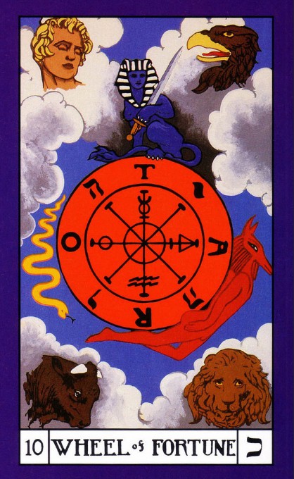 The four figures in the corners have only their heads showing and are separated from the central figure by the oval wreath – compare this to the Wheel of Fortune card where they are complete figures and more involved in the process of the card.
