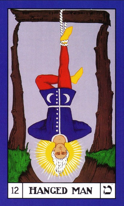 This card symbolises simple, direct conscious awareness compared to working through our subconscious nature symbolised in The Moon. The naked childlike figure represents our ability to detach ourselves from the false senses of self we have accumulated through our life up to this point. We are now able to surrender that to a much greater source of direct illumination and expression. The other two cards in the same column also point to a sacrifice being made (The Hierophant and The Hanged Man) to a higher principle. All three share the quality of acceptance in oneself and self-awareness as a means of finding and expressing our higher self.