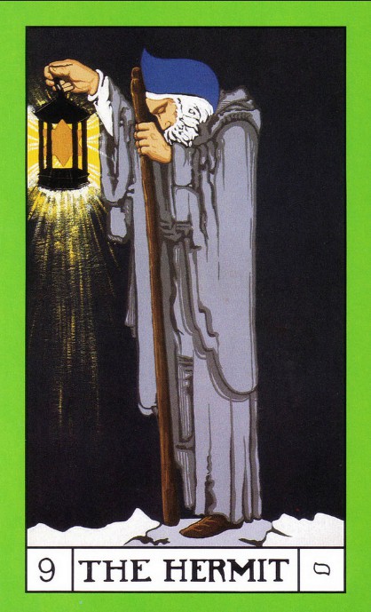 The card shows the Initiate carrying a bag over their shoulder which contains the qualities they need to sort out in their self as well as the tools they need to use on their spiritual path.