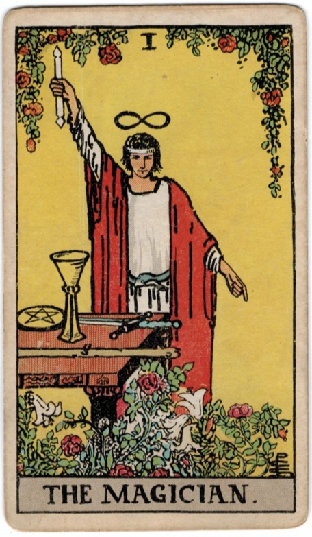 The Magician is the first person that the Fool encounters. He wears white symbolising inner purity & his red robe symbolises purposeful activity (1st Ray). He draws power from above bringing it into manifestation (through the left hand). The 4 suits represents the 4 elements; Wands=fire, Cups=water, Swords=Air, & Pentacles-Earth.