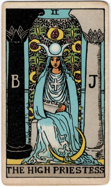 She represents the Fools spiritual mother & sits between 2 Qabalistic Pillars, B=Boaz , pillar of severity, femininity, passivity & J=Jakin, pillar of mercy, masculinity, activity. The scroll reads TORA which means natural law. Rearranged the words read TARO, hence the taro represents the natural law of life.