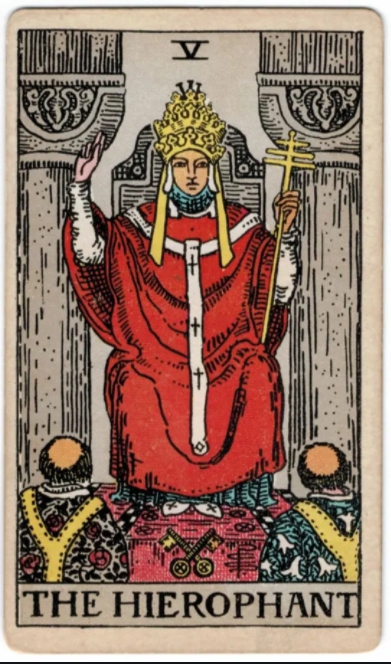This is the Fools spiritual father. The pillars representing the duality & balance that needs to be struck between opposites. He holds 2 fingers upwards & 2 curled in the palm of his hand. This symbolises spirit & matter, Gods & men, & the Hierophant acts as the link between the two.