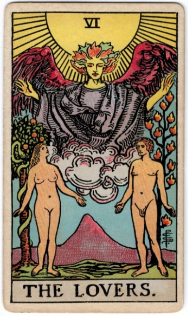The mountain is halfway between the two, which means that each partner has equal distance to travel to obtain harmony with the other. The card teaches that love is not a simple matter of physical and intuitive attraction, but is also the union of mental (male), emotional, (female) & spiritual (represented by the angel) levels.