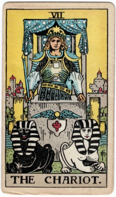 They both pull in different directions & it is the job of the Fool (Charioteer) to keep them under control. From this card the Fool must learn how to steer a middle course through the battleground of his opposing feelings, thoughts & desires. Having experienced the complexities of love, this card brings forth the next trial of youth, namely conflict.