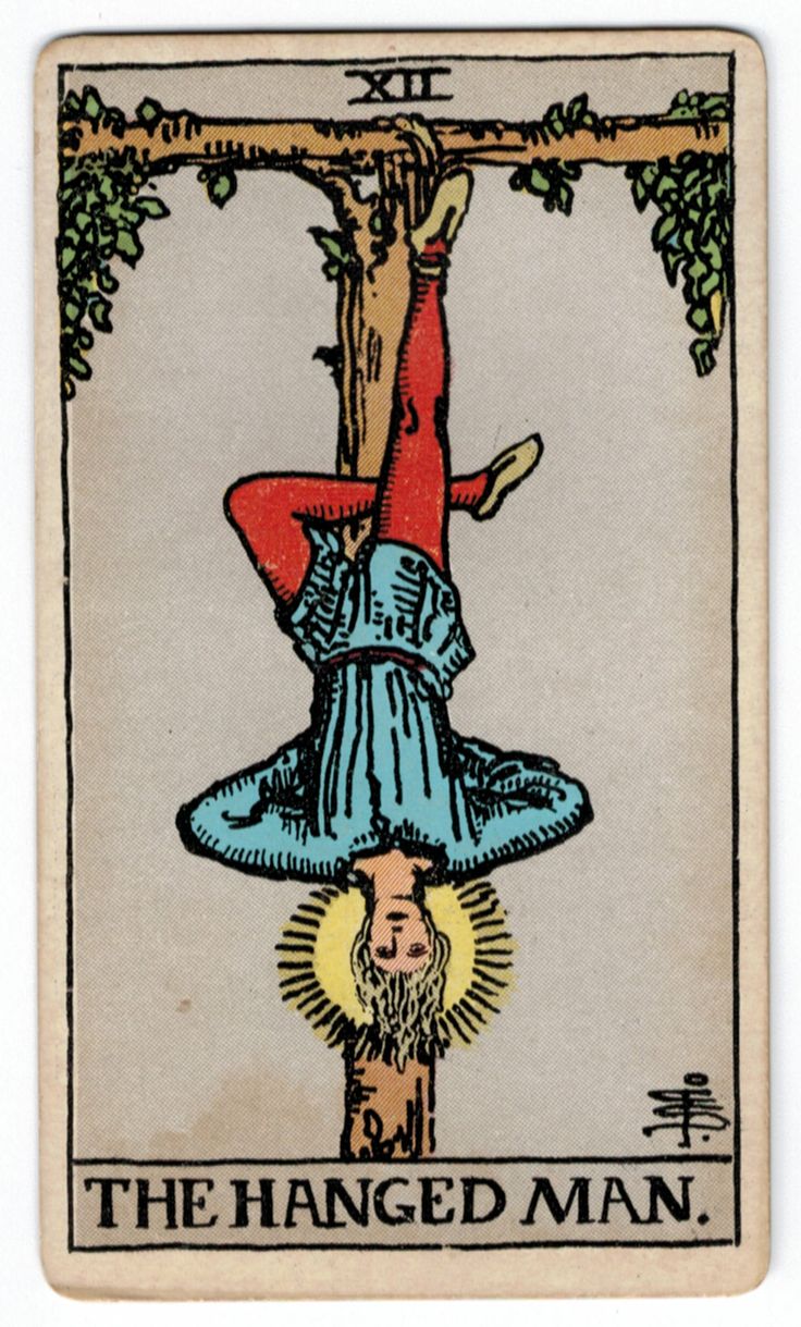 His face suggests enchantment rather than suffering. The card indicates a reversal of the mind than of the body, a reversal of one’s thinking but a sacrifice is needed.