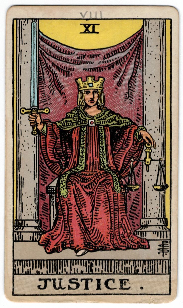 This is analogous to the zodiac sign of Libra which symbolises balance. Justice teaches the Fool to discriminate, to make dispassionate evaluations & the impersonal decisions that the intellect is concentrated upon at this stage of his journey. It stands for clear thinking & a balanced mind.