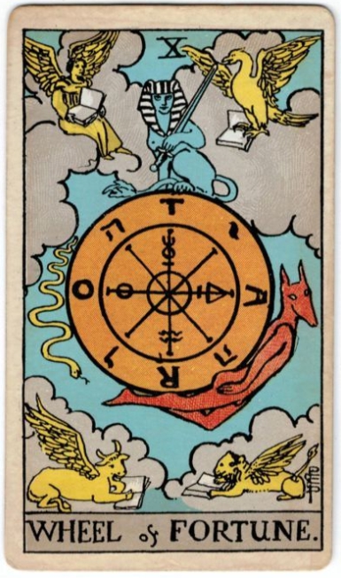 In summary, the card represents both stability & change, the external, changing world at the edge of the wheel, & the unchanging true consciousness of man at the hub. Fate moves the circumference of the wheel, the hub enables the rim to change. Taro at the 4 compass points indicates the natural & predestined law of life. Each man is responsible for his destiny & although circumstances are determined, man has ultimate control over how he deals with them.