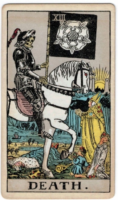 The Hanged Man demonstrates the Fools willingness to surrender his ideals whilst the Death card strips him bare of all his pretentions & lies him naked for his next lesson.