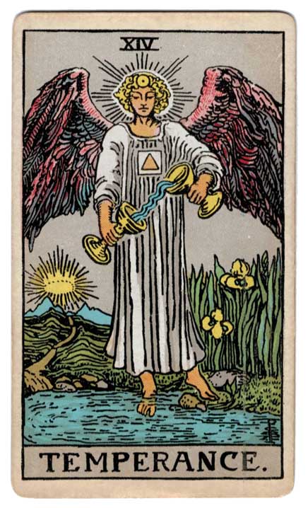 The angel pours the waters of the emotions from the golden cup (symbolising consciousness) into the silver cup (symbolising the unconscious), thus showing the need for a constant flow between the two; water which does not flow stagnates, as do feelings. In summary, Temperance offers to teach the Fool compassion & forgiveness, taking into account the feelings in situations rather than just factual circumstances. The feelings strive for a sense of calm & serenity, the equivalent of what the mind knows as Justice.