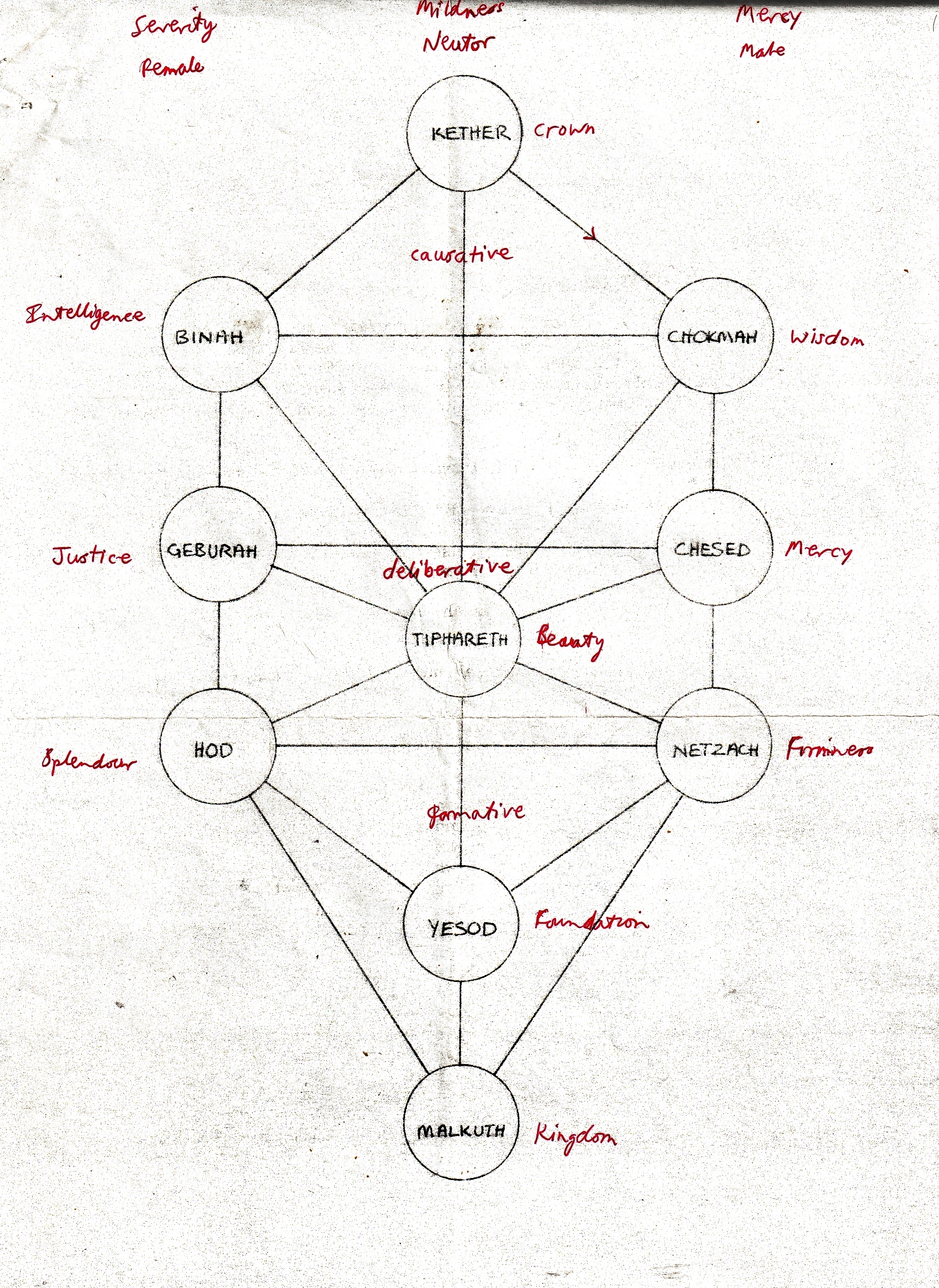 1. Kether is the Crown and as such has origin as its attribute. In action it is wisdom since this is the highest quality that can be conceived of. Wisdom is a male potency in that it is the energy that intelligence, its polar opposite contains. All the sephira which are opposite one another on the tree are two halves of one thing. Whilst wisdom and intelligence are necessary for an intention to occur, they must have a field in which to work and this is provided by the deliberative triad which works into the matter of the formative triad.