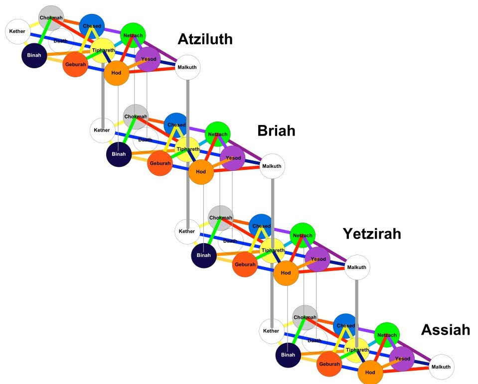 Many concepts surround Qabbalistic cosmogony. Often it is to be found today used primarily as a vehicle for contemplating metaphysical subjects. The symbolism can be very involved… One system is that there are five worlds, one spiritual and four material, namely causal, mental, astral and physical. A tree is then placed in each world so that the Crown of physical equals the kingdom of astral. Another method places the four worlds upon the tree itself showing the adaptability of the symbolism.