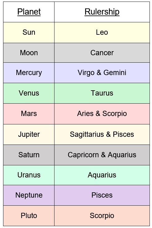 Each one of the twelve zodiacal signs has a special relationship to one and sometimes two planets and there is a strong compatibility between this planet or planets and the particular sign. This relationship between planets and signs rulership. We can see from the table below: