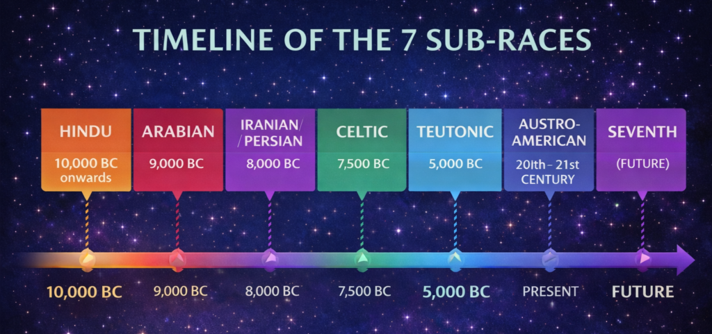 - Classical Theosophical literature (Blavatsky, Besant, Leadbeater, and later summaries) describe seven sub-races within each Root Race.